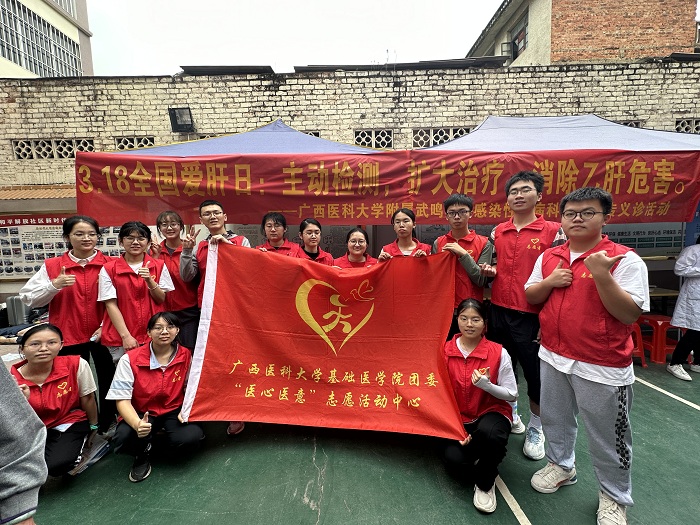为深入学习贯彻党的二十大精神,全面贯彻落实习近平总书记关于学雷锋志愿服务的重要指示精神,响应世界爱肝日“主动检测、扩大治疗、消除乙肝危害”的号召,3月18日,beat365英国官网网站团委“医心医意”志愿活动中心与beat365英国官网网站附属武鸣医院义诊团队一同于武鸣区和平解放社区居民委员会开展义诊服务活动。