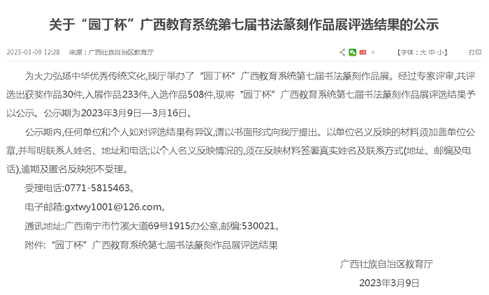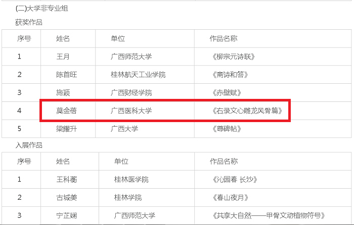近日,由广西壮族自治区教育厅举办的“园丁杯”广西教育系统第七届书法篆刻作品展评选结果公布,2020级临床医学8班莫金蓓同学的作品《右录文心雕龙风骨篇》在大学非专业组的评选中获奖,是公司唯一入选并获奖的作品。据悉,此次评选共评出获奖作品30件,入展作品233件,入选作品508件,其中在大学非专业组中,共评出获奖作品5件,入展作品28件,入选作品43件。