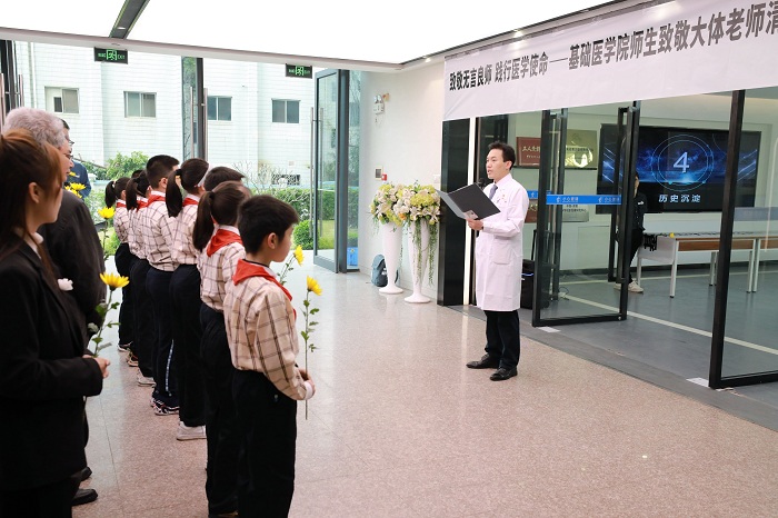 “他们用自己的躯体架起了学子们通往医学殿堂的桥梁……”,基础医公司党委书记谭机永在活动致辞中谈到,遗体和器官捐献者们用大爱推动了现代医学教育和医疗事业的发展,无言地为社会和人类作出了最后的贡献。谭机永勉励同学们要感悟生命价值,传承奉献精神,潜心学习钻研,勇攀医学高峰。