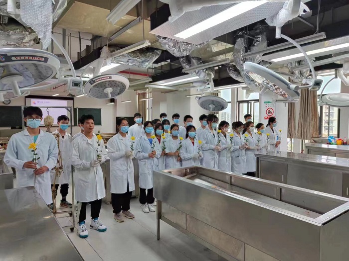 “感谢您每一个学期的默默教导,我们不仅学到了解剖学知识更学到了您的人间大爱……”,2020级临床医学“5+3”专业的员工代表徐若翔带领全体师生深情朗诵《生命的礼赞》,表达对“无言良师”崇高的敬意和深切的缅怀。随后,全体人员列队依次向郭德林教授深深鞠躬献花,表达师生对献身医学事业的无言良师们的崇高敬意和深切缅怀;活动最后,全体参会人员在活动横幅上郑重签名,表明心志。根据安排,公司在南宁-武鸣校区的医学本科生中也陆续借助人体解剖实验课契机,同步开展系列致敬“大体老师”清明追思活动。