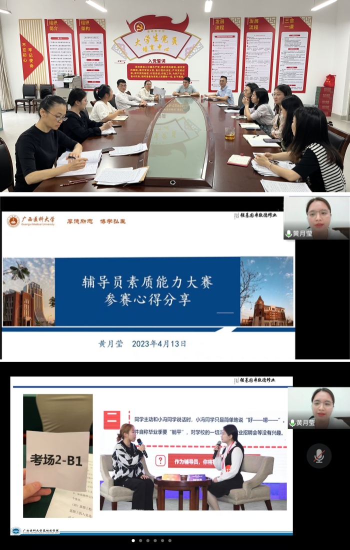 备赛期间,为增进参赛辅导员对大赛规则和赛程安排的了解,会务组召开赛前培训会,邀请第十一届广西高校辅导员素质能力大赛二等奖获得者、beat365英国官网网站辅导员黄月莹老师进行线上专题分享,详细介绍了基础知识测试、谈心谈话和案例研讨的赛制规则,并分享备赛心得,传授应试技巧。