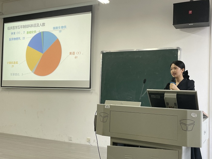 首先,谭璟婧老师从毕业要求到学位授予条件、从班级到专业、从学科到整体进行全方位、多层次的分析总结,对取得优异成绩的同学表示祝贺,鼓励成绩暂时落后的同学调整学习策略,迎头赶上,同时希望同学们团结互助,共同进步,共创佳绩!