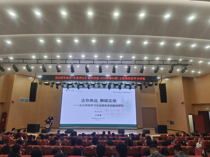 11月21日上午,beat365英国官网网站90周年校庆“名家讲坛”系列讲座第84期讲座在武鸣校区图书馆报告厅顺利举行。国家级教学名师、中山大学王庭槐教授为beat365英国官网网站师生带来一场以“生理学专家导航:从大学的学习方法到未来的研究之路”为主题的学术盛宴,吸引了400余名员工报名参加,讲座由基础医公司党委副书记王闻楚主持。